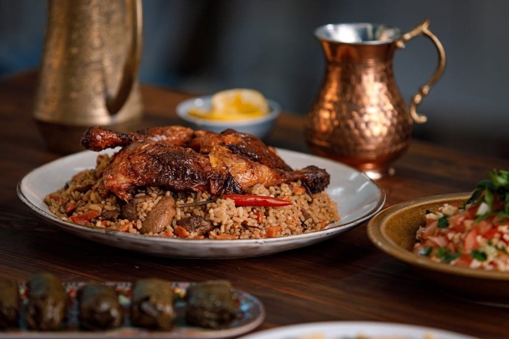 Saudi Arabia’s national cuisine, kabsa, is a fragrant rice and meat dish that’s usually presented on communal trays. It is similar to Ruz Al Bukhari, but with a special combination of cardamom, cumin, and coriander. The meal is typically served with fiery tomato sauce (salata hara) and garnished with caramelised onions, raisins, and pine nuts. A cornerstone of gatherings with relatives, kabsa is a true embodiment of traditional Saudi cuisine.